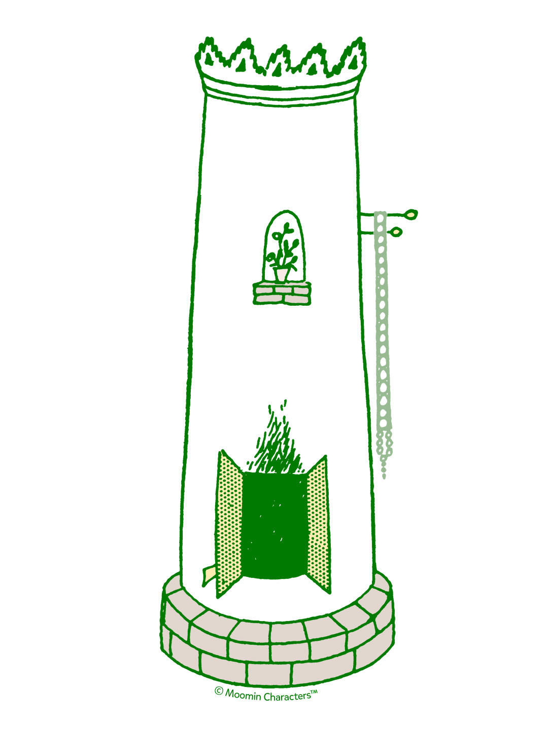 今のムーミンやしきが建つずっと前、ムーミンのご先祖たちは人間の家のタイルばりのストーブの後ろに住んでいました(ムーミンやしきが背が高く、丸みを帯びているのはこのためです)。