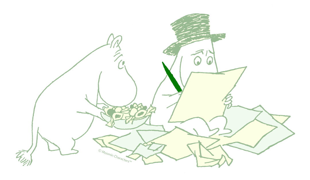 小説『ムーミンパパの思い出』では、ムーミンパパ自身が回想録として記した、青春時代の冒険が描かれています。ムーミンパパは新しい友だちとの出会いや、海でムーミンママを助け出したこと、おばけに遭遇したことなど、人生の刺激的なできごとを記録していますが、書き留めているのはそれだけではありません。哲学的な思考やプロジェクトの計画、新しい本など、ムーミンパパは常に何か書いているのです。小説『ムーミン谷の夏まつり』では、戯曲をまるごと一本書き上げたのですよ!