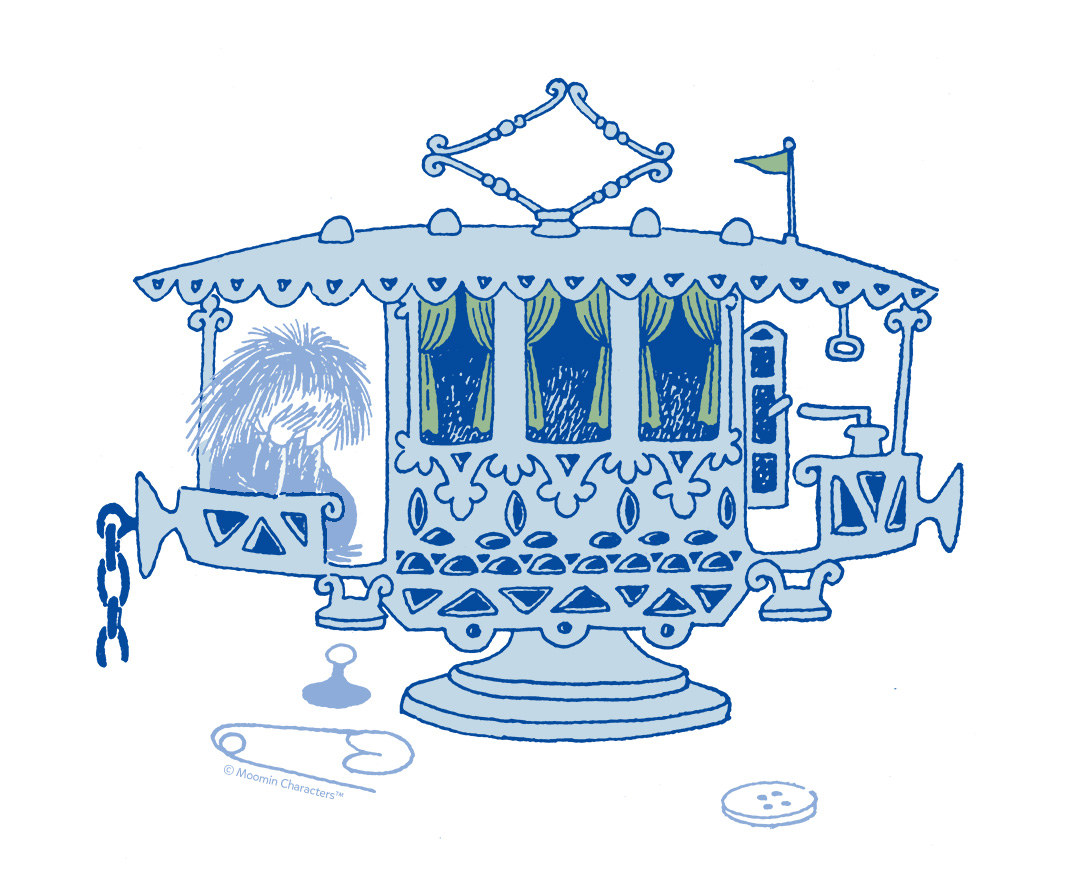 海泡石の電車は、ムーミン一家の宝ものとして大切に受け継がれてきたもので、ボタンや安全ピンをしまうのに使われています。小説『ムーミン谷の冬』では、サロメちゃんという名の小さなはい虫の女の子がこの電車の中で暮らしていましたが、電車の中には安全ピンやら何やらがあるので、あまり寝心地がよくはありませんでした。