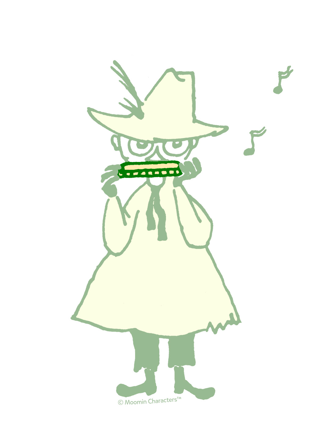 スナフキンのことをよく知っているなら、彼が「持ちもの」をまるで”招かれざる客”のように扱うのを知っていることでしょう。彼にとって人生はそんなものがない方がずっと良いのです。スナフキンは、テントやおやつ、ついでに求められていない助言などもあっさり人にあげてしまいますが、ハーモニカだけは決して手放しません。ハーモニカはスナフキンにとって一番大切な(古い緑の帽子と並んで、ただひとつの)持ちものです。ものを所有するのが嫌いなスナフキンにとってぴったりの小ささで、持ち歩きもしやすいんです。