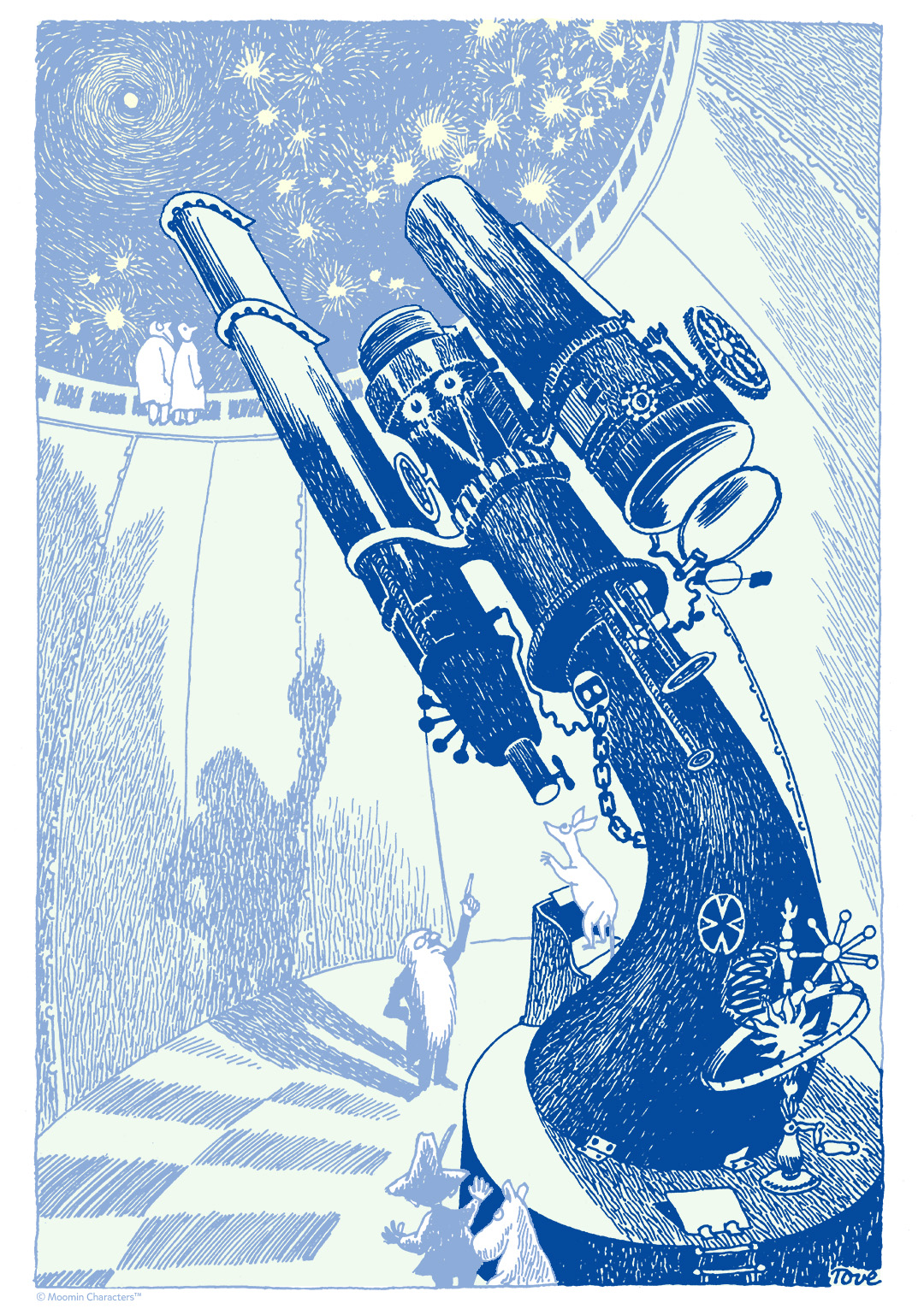 小説『ムーミン谷の彗星』では、ムーミントロールとスニフ(そしてスナフキン)が、宇宙についてと、ムーミン谷に迫る未知の脅威についての答えを見つけるために、天文台を目指して冒険に出かけます。天文台はおさびし山のてっぺんにあり、ガラスの屋根の上には見事な望遠鏡が設置されています。