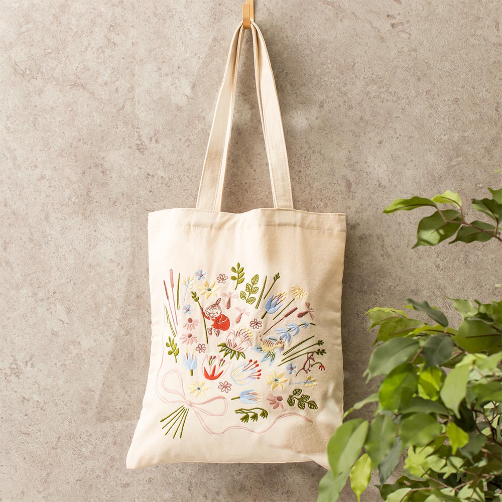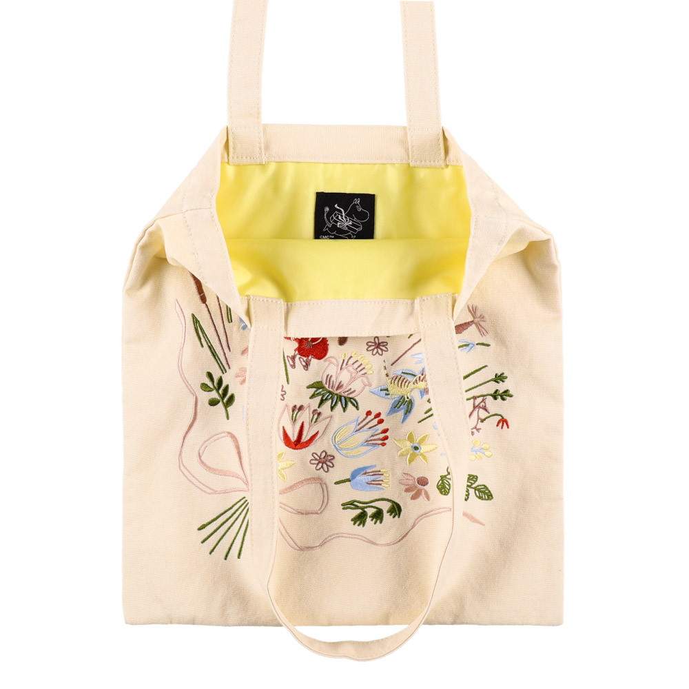 ムーミン谷の春をイメージした、お花の刺繍が全面にあしらわれたA4サイズのトートバッグ
