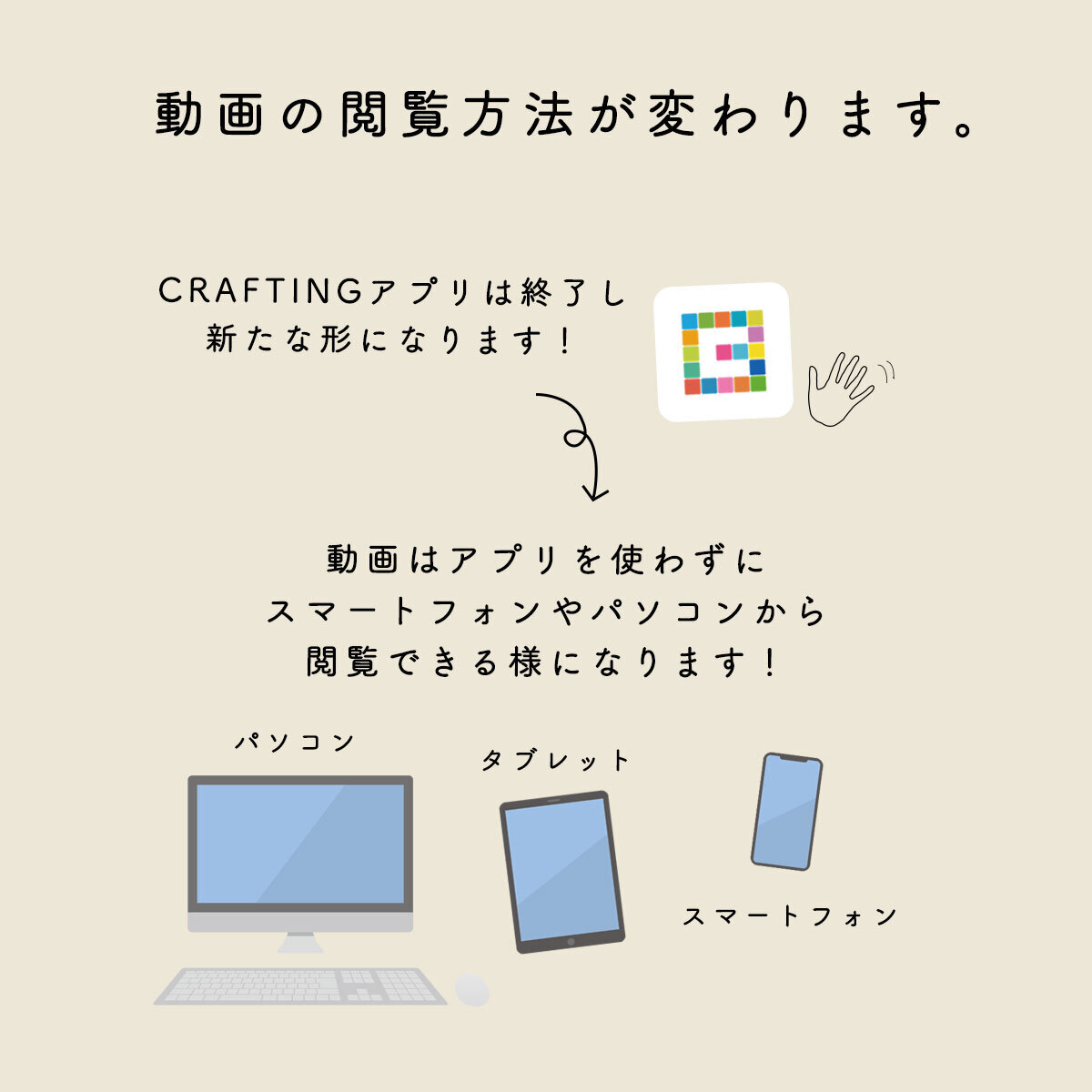 スマートフォンやタブレットにダウンロードしてご利用いただいていたCRAFTINGアプリのサービスが終了し、動画はCRAFTINGサイトのマイページからご覧頂けます。