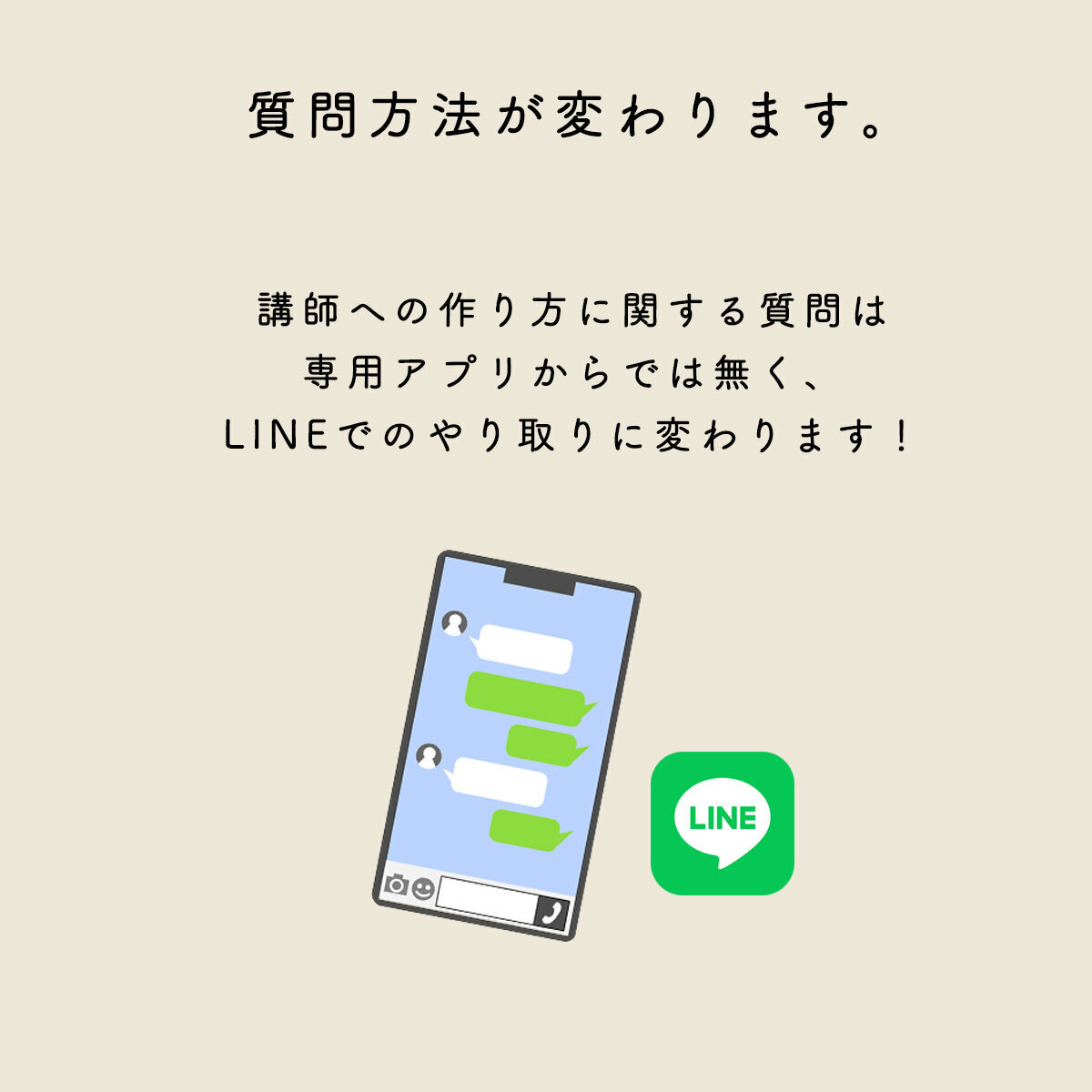 CRAFTINGアプリの終了に伴い、担当講師への質問はLINEを使って行います。資格取得講座の課題もLINEからご提出。購入完了メールに記載のLINEお友だち登録用のリンクからご登録をお願いします。