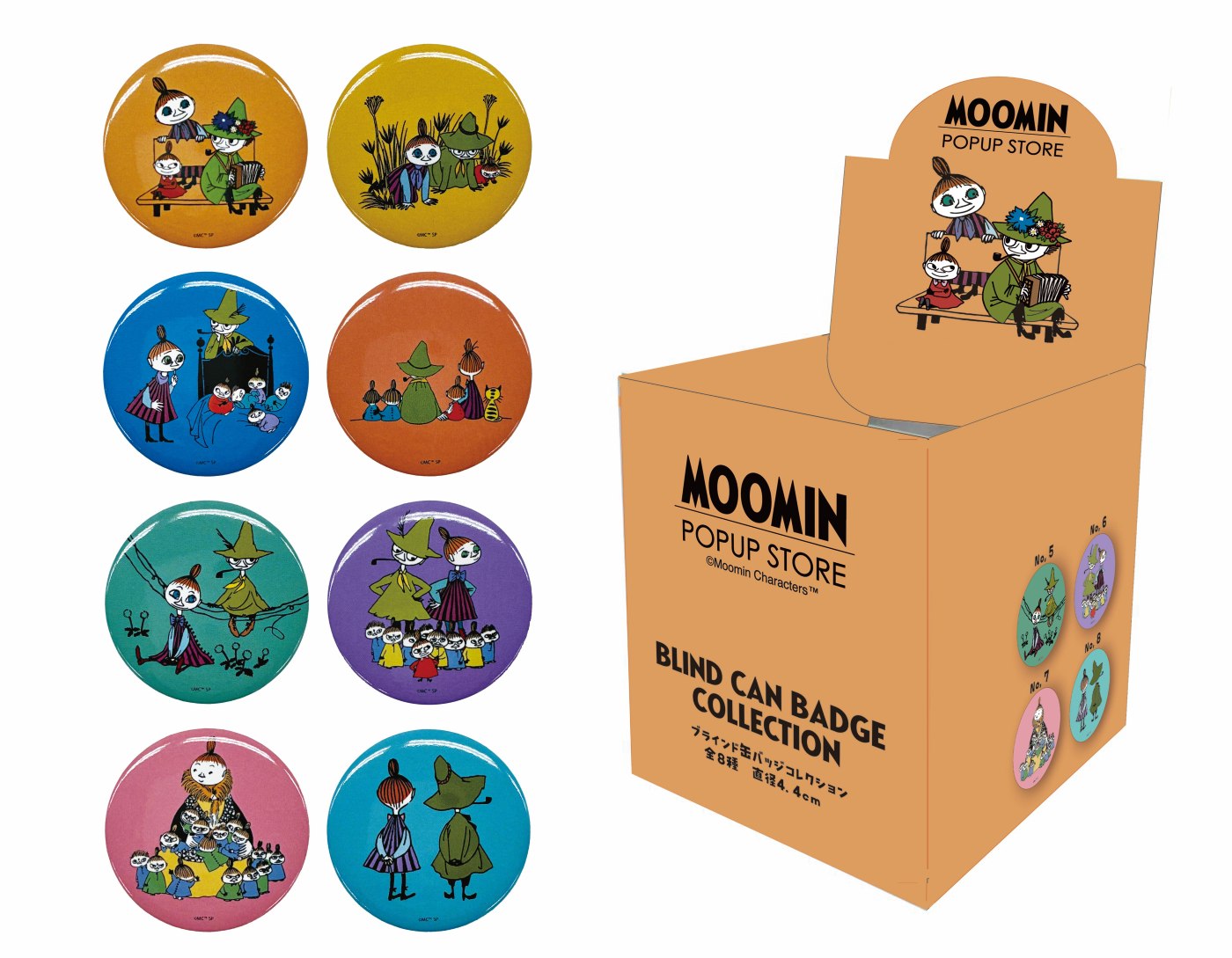 ミムラねえさんやリトルミイ、スナフキンなど、ミムラファミリーがデザインされた8種類の缶バッジ!