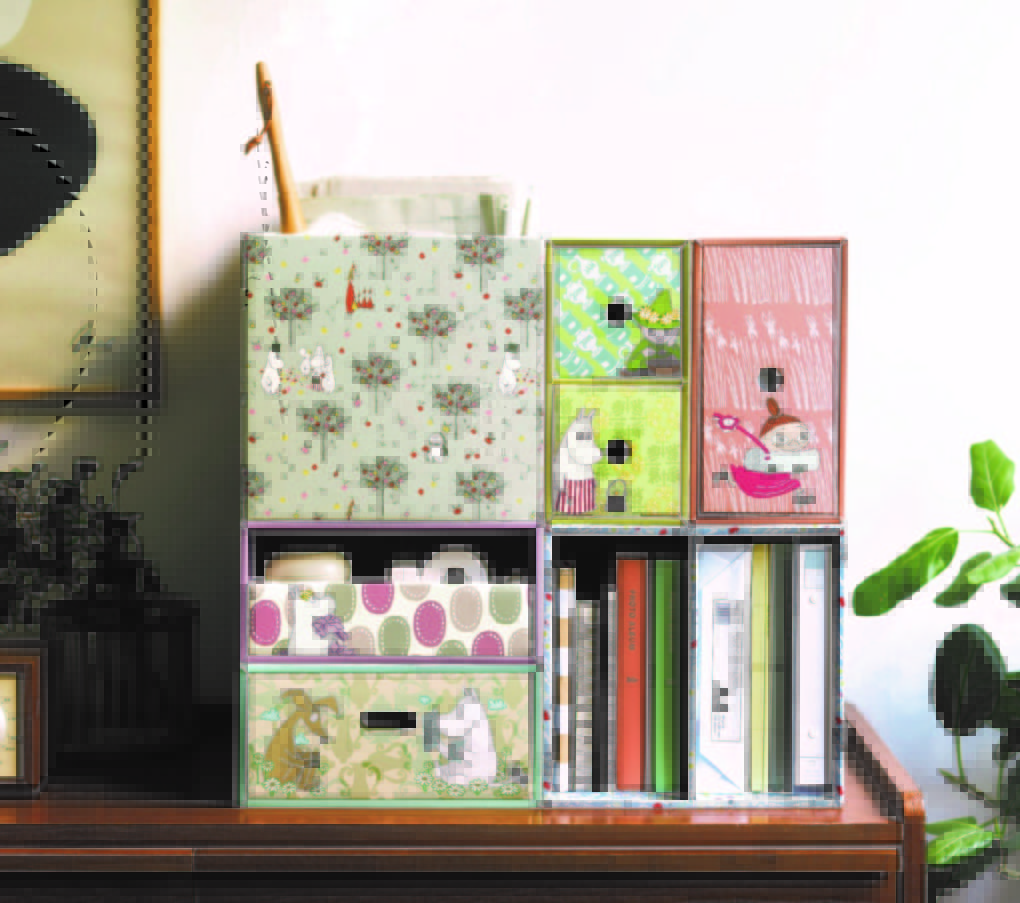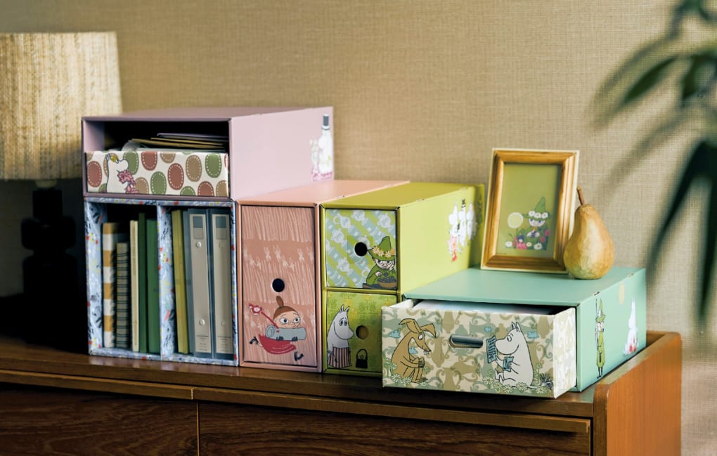 ひとつずつでも、組み合わせても、いろんな場所で活躍する収納ボックス。 お部屋になじむ北欧風の色使いで、ムーミン谷のほっこりした世界観を表現したデザイン。 お揃いデザインのポストカード&中身を書き込めるシールタグ付き!