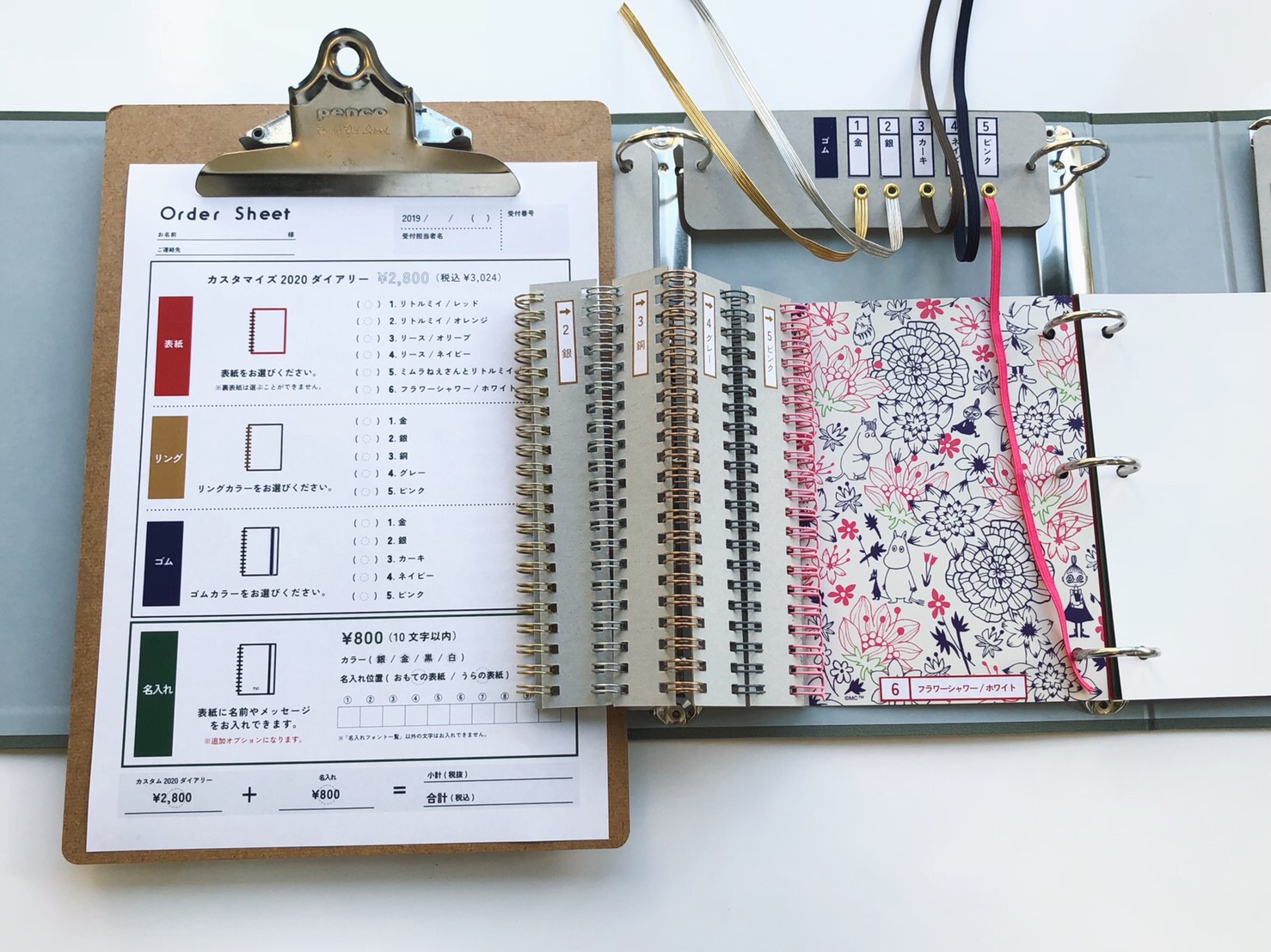 表紙は全部で6種、そしてリング5種やゴムバンド5種の中から自由に組み合わすことができますよ。