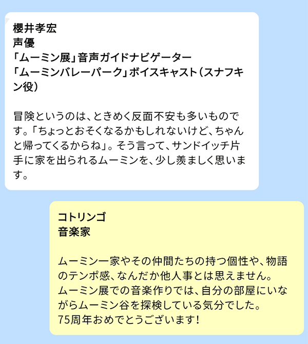 ムーミン75周年を記念して、各業界の関係者75名の皆さまから、お祝いメッセージの第二弾が届きました!