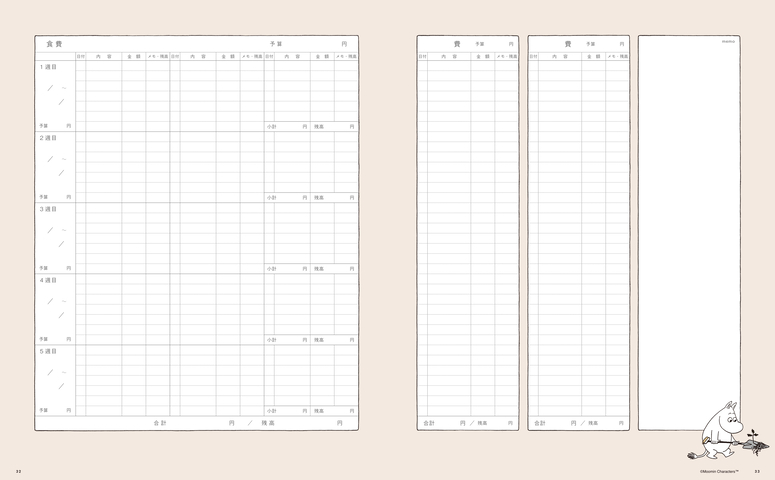多くの家計簿は、食費、日用品費、レジャー費など、あらかじめ費目が印字されているものもありますが、『ムーミン家計簿』で印字されている費目は食費のみ。残りの11ある費目欄は、使う方の生活スタイルに合わせて自由に設定できるので、家計簿記入に挫折した経験がある人でも、取り組みやすいはず!