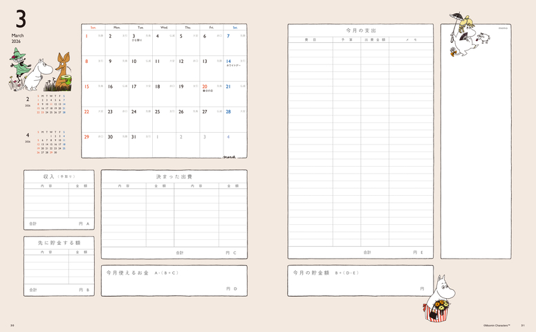 『ムーミン家計簿』が長年みなさまに愛されている秘密は、何と言ってもシンプルでおしゃれなところ。最初に各月の収入や、家賃などの決まった額の出費を書き込んでいくと、その月に使えるお金が見えてきます。あとは、あらかじめ決めた予算を意識して1ヶ月過ごすだけ。