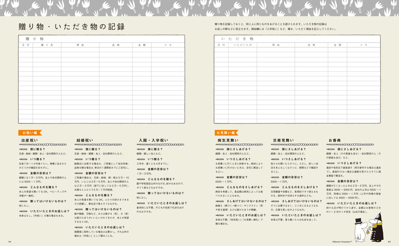 家計簿の後ろの方には、年間の終始記録のほか、贈り物や頂き物の記録などもついているので、日々のちょっとした記録にも使えます。費目の立て方のヒントもあるので、参考にしてみてください。