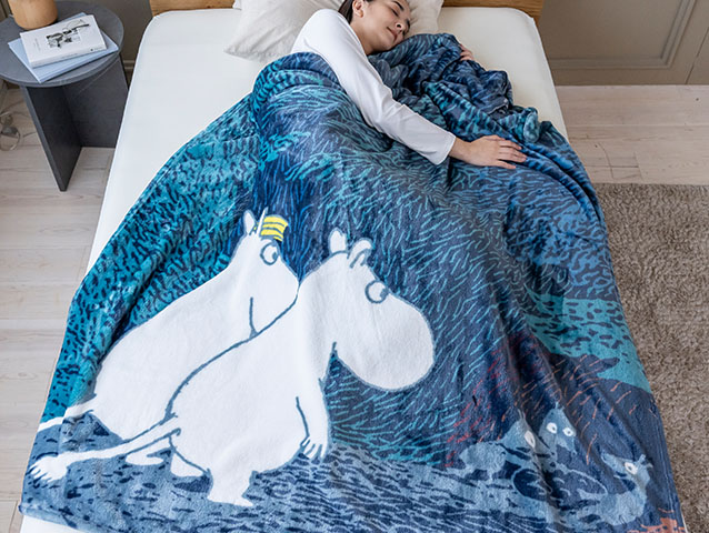 ムーミン小説の挿絵をベースにした、華やかな全面デザイン毛布です。