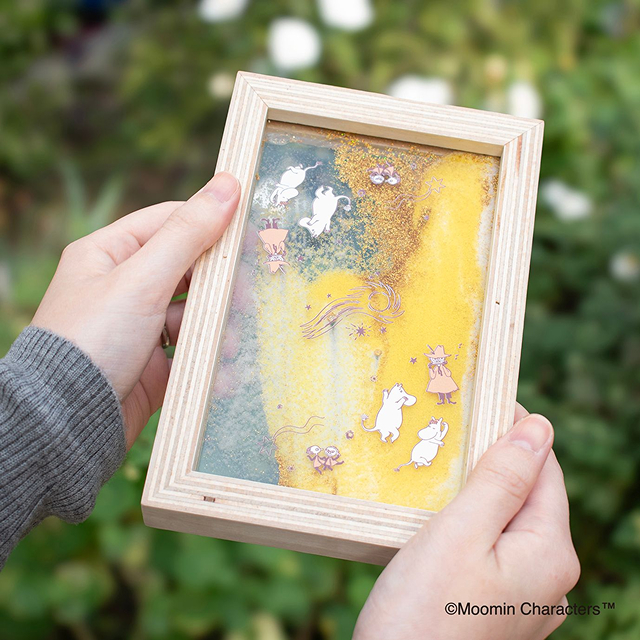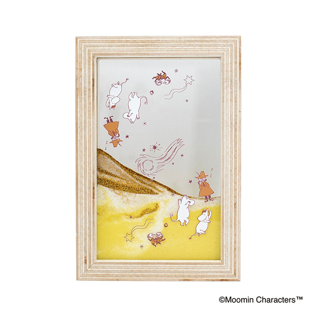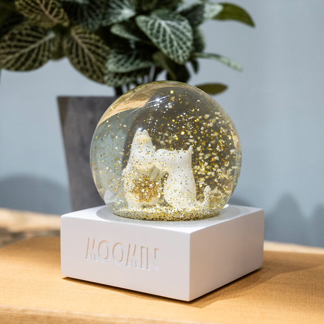 ドームをそっと揺らすと、ムーミンとスノークのおじょうさんのまわりにゴールドのグリッターがきらめきながら舞い上がり、まるで物語の世界がふんわりと広がるよう。