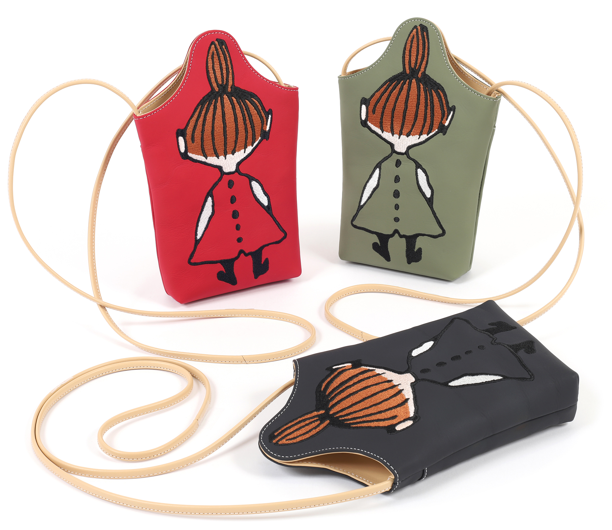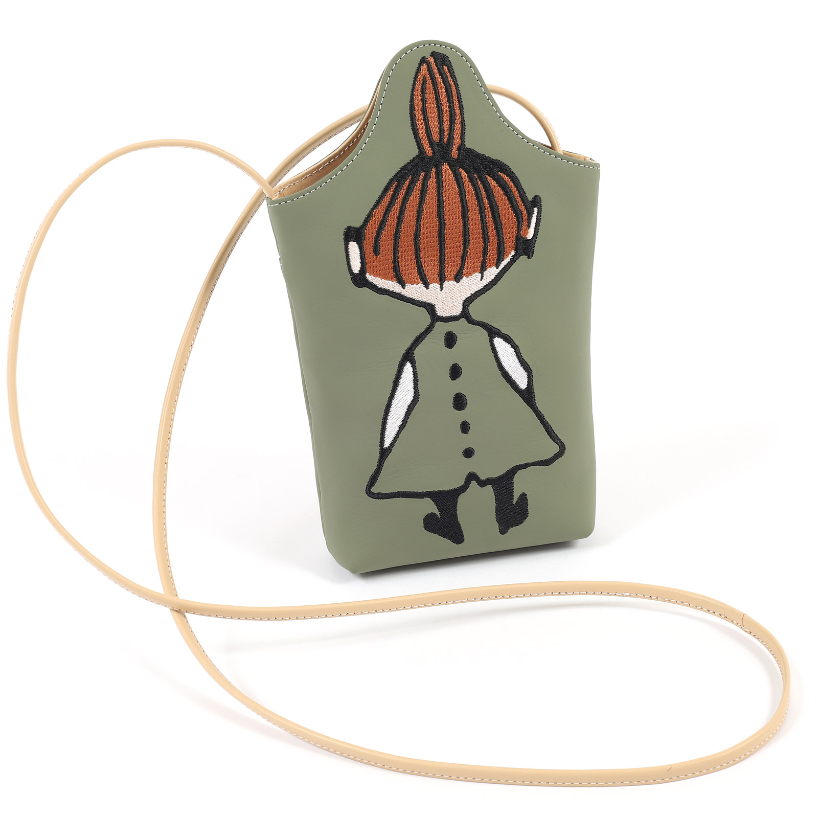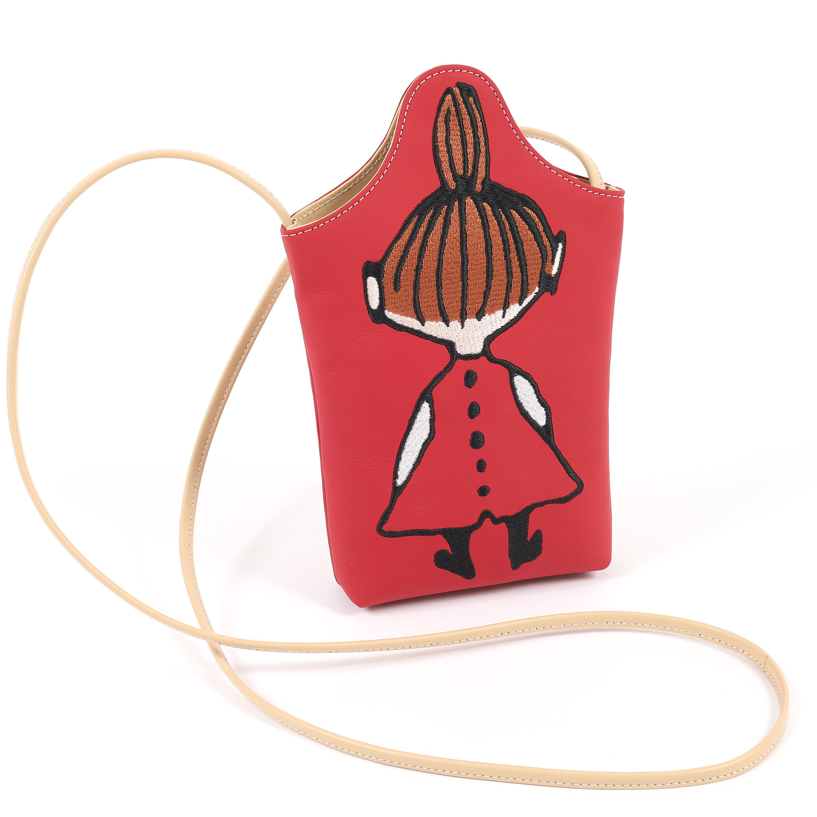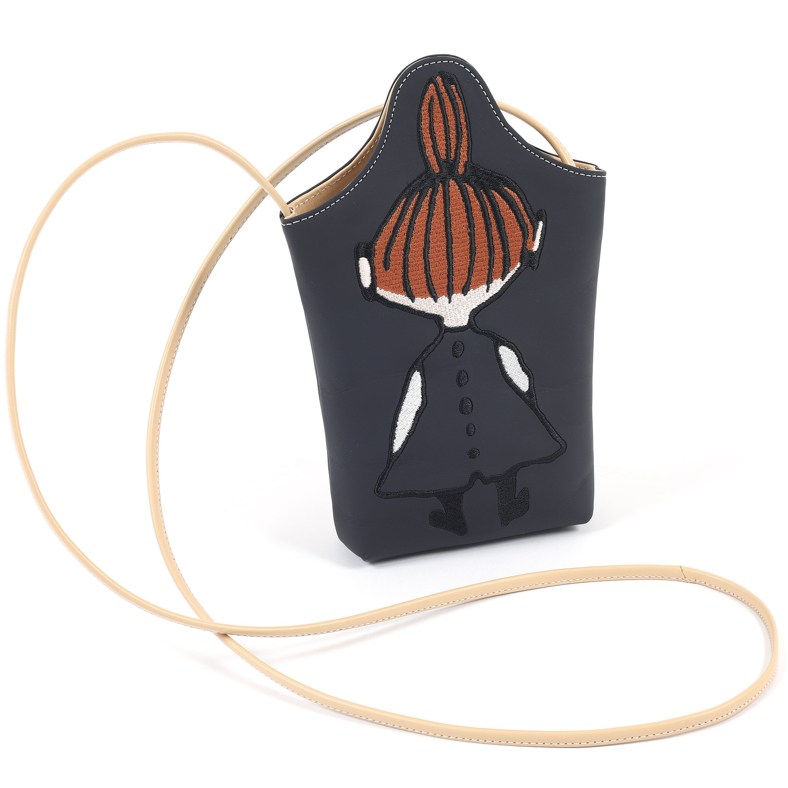 大人気のリトルミイ二折財布と連動したスマホショルダーが登場です!かわいいリトルミイの後ろ姿を贅沢に刺繍で表現しました。タマネギ型のおだんご頭に沿った口元のデザインになっていて、スナップボタンで開閉できます。ショルダー紐は中で結んで調整が可能になっています。内装に隠れたリトルミイの素押しがワンポイント。おそろいのリトルミイの二折財布も収納可能★