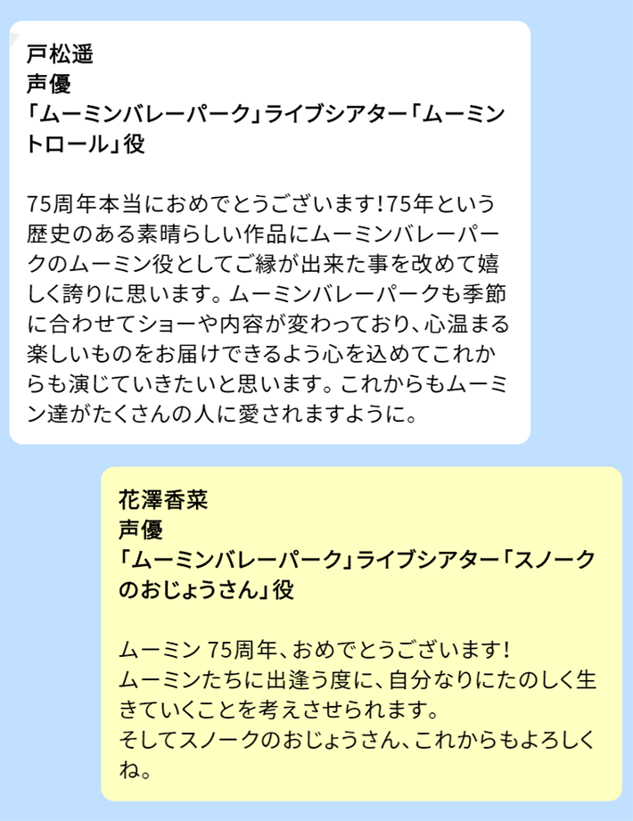 今回は戸松遥さん(声優、「ムーミンバレーパーク」ライブシアター「ムーミントロール」役)をはじめ、27名の方のメッセージをご紹介します。
