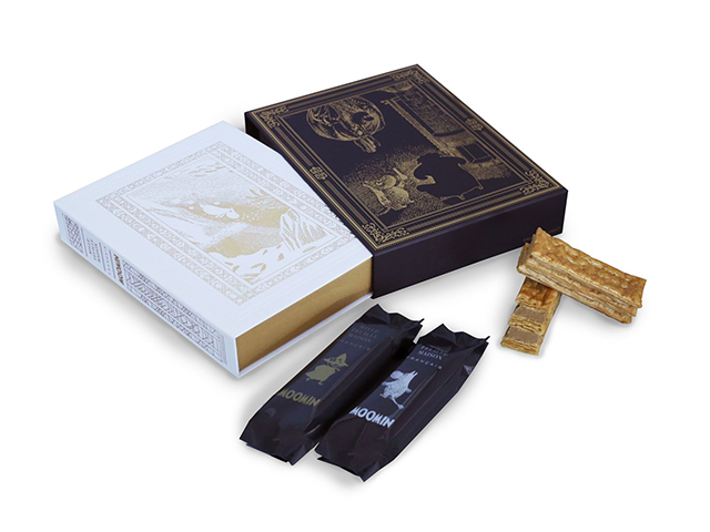 オリジナルの箱が本のような形であるのをヒントに、原作小説にあるいくつかの挿絵を箔押しで箱に表現しました。さらに同じ手法を用いたスリーブケースもつけ、“大切な本”仕立てに。トーベ・ヤンソンの描く線画が際立ち、食べ終わった後も手元に残しておきたくなります。