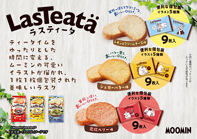 個包装パッケージに、ムーミンのかわいいイラスト(全5種)が描かれていることもポイント。個包装では、ムーミン達が「家族」「友人」「恋人」と過ごす時間を切り取って描いています。詳しくは、おやつカンパニー「ラスティータ」特設ページをご覧ください。https://www.oyatsu.co.jp/product/lasteata/