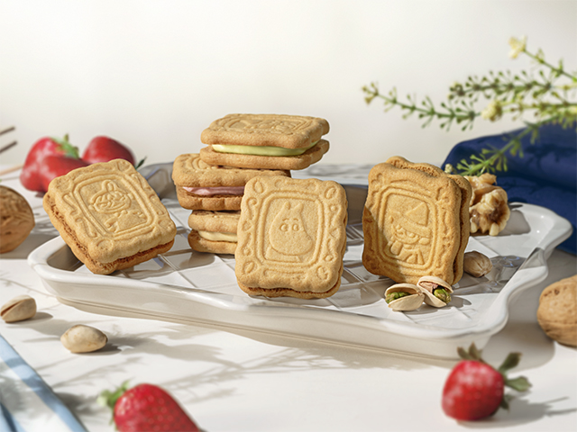 1年間で累計47万個突破した代表作。コク豊かでミルキーなホワイトソイショコラに森の実りを練りこみました。ムーミン柄はクルミ味、リトルミイ柄はストロベリー味、スナフキン柄はピスタチオ味。ムーミンたちがかわいい、サクサクおいしい分厚いサンドです。